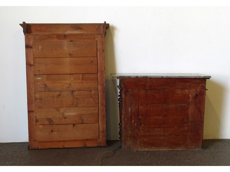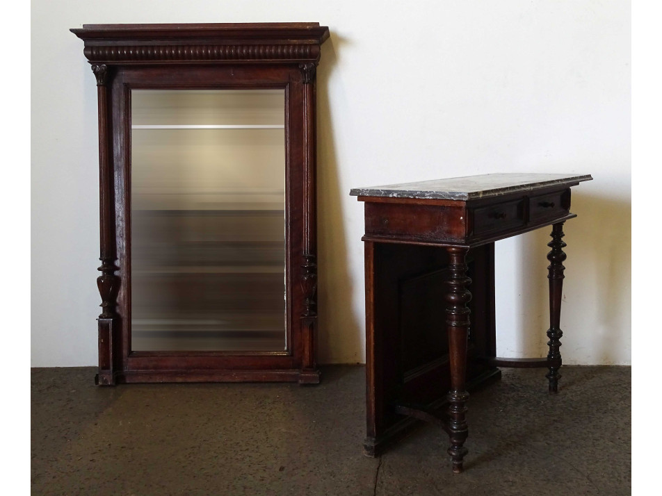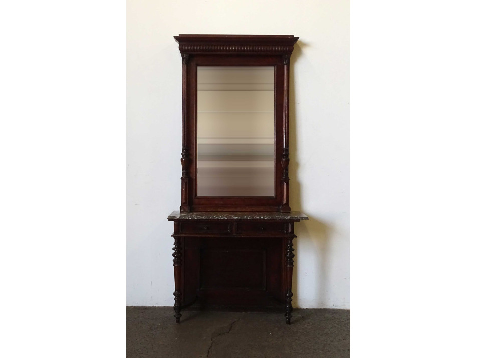 Antik, szép állapotú, kétfiókos, márványlapos ónémet konzolasztal, nagymérertű, falra akasztási lehetőséggel rendelkező, deszkázott hátlapú, faragott fali tükörrel. A tükörkeret baloldali oszlopának egyik alsó eleme hiányzik.