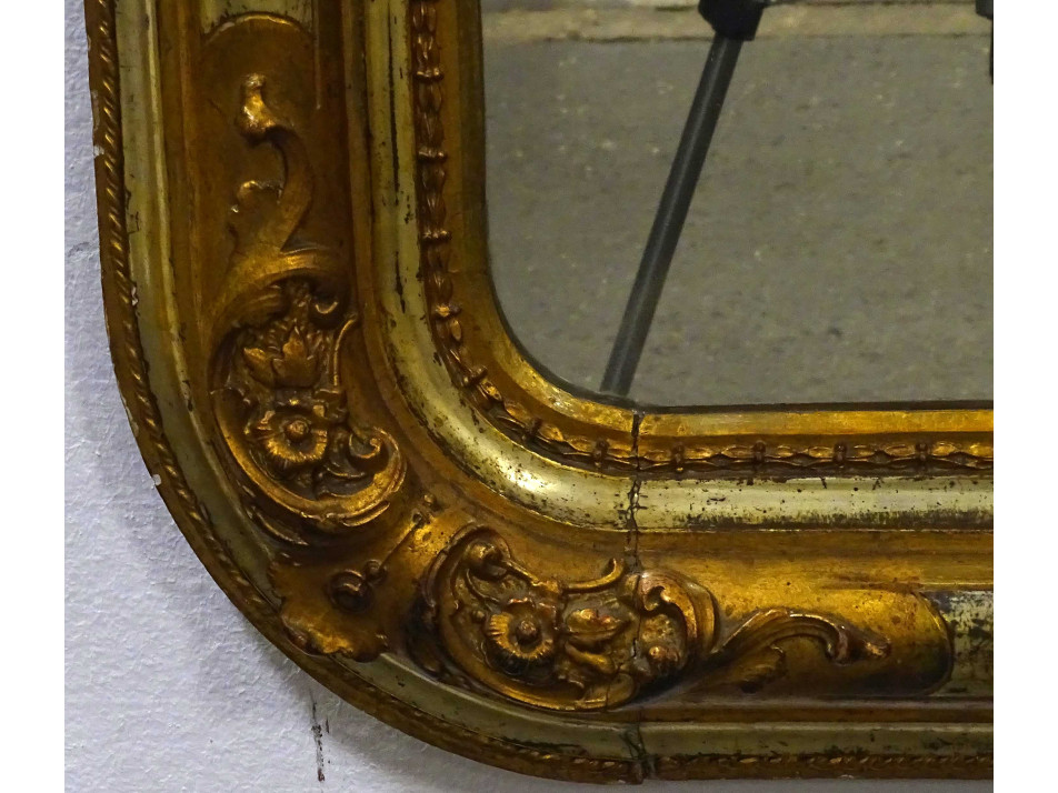 Antik, nagyméretű, aranyozott biedermeier fali tükör, szép eredeti állapotban, falra akasztási lehetőséggel. Benne eredeti vastag, nehéz tükör található, teljesen ép, vakfoltmentes állapotban. Hátulja deszkázott.