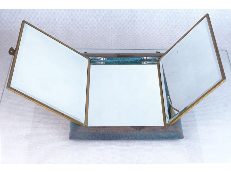 Antik, réz láncos falra akasztási lehetőséggel rendelkező különleges háromrészes tükör, falitükör.