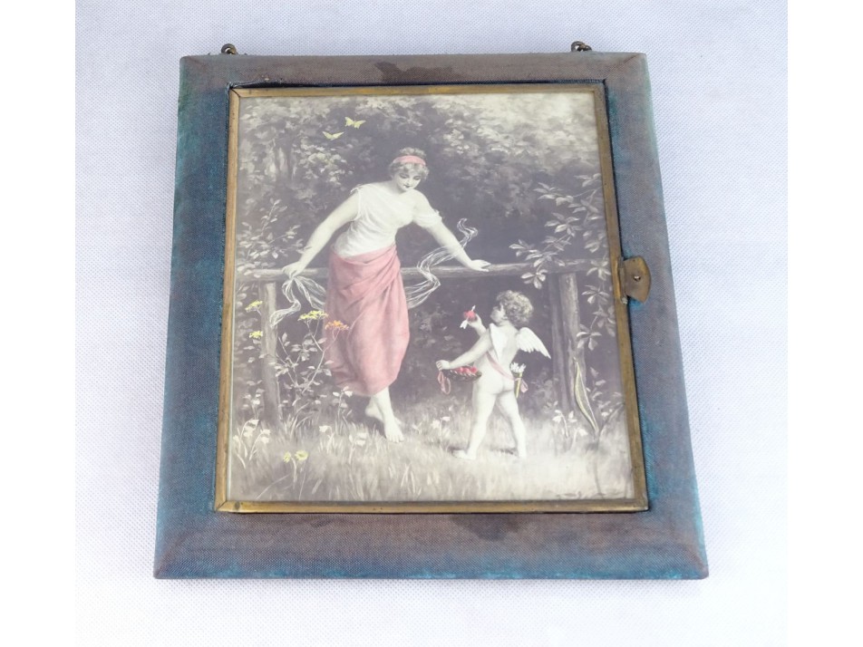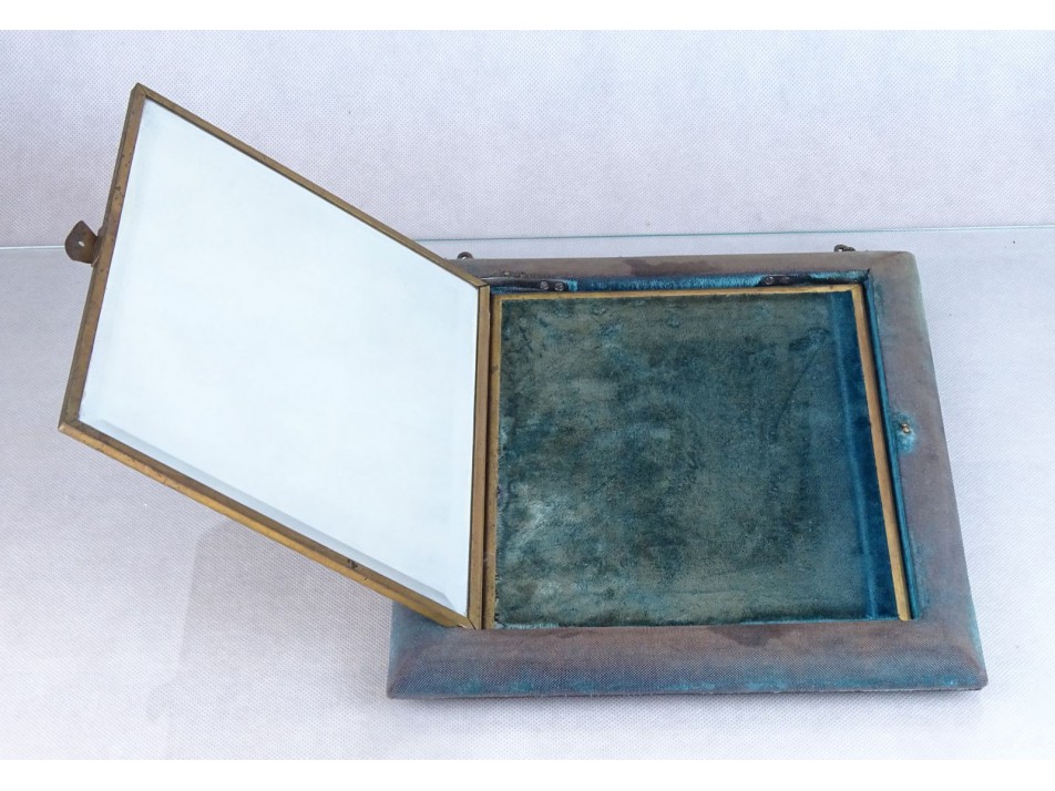 Fedlapján kívülről egy Ámor jelenet látható réz keretben. Ezt kihajtva szép állapotú metszett, fazettázott kétszárnyú tükör található.