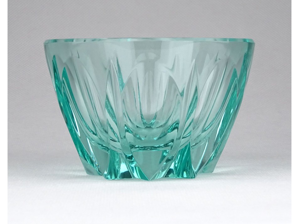 Hibátlan állapotú, türkiz színű, vastag falú csiszolt üveg tálka. Alján 8 ágú csillag alak rajzolódik ki.