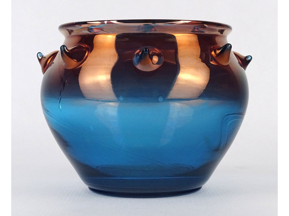 Gyönyörű velencei bütykös irizáló bikolor fújt üveg kaspó amelyet Murano szigetén, Velence közelében, Olaszországban készítette Gino Cenedese. A kaspó fala sajnos repedt, lásd fotó. Hibátlanul nagy értékű, cca 150ezer forint körüli értéket képvisel.