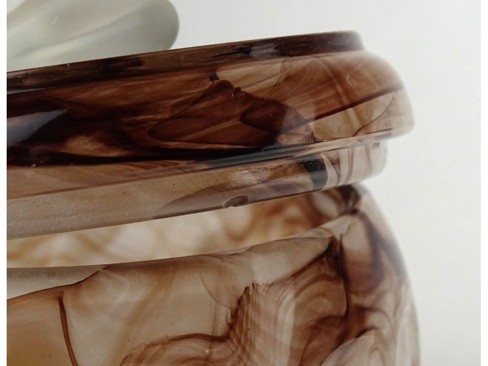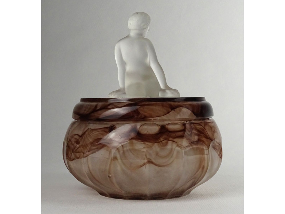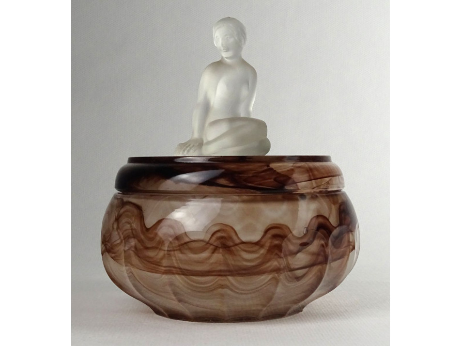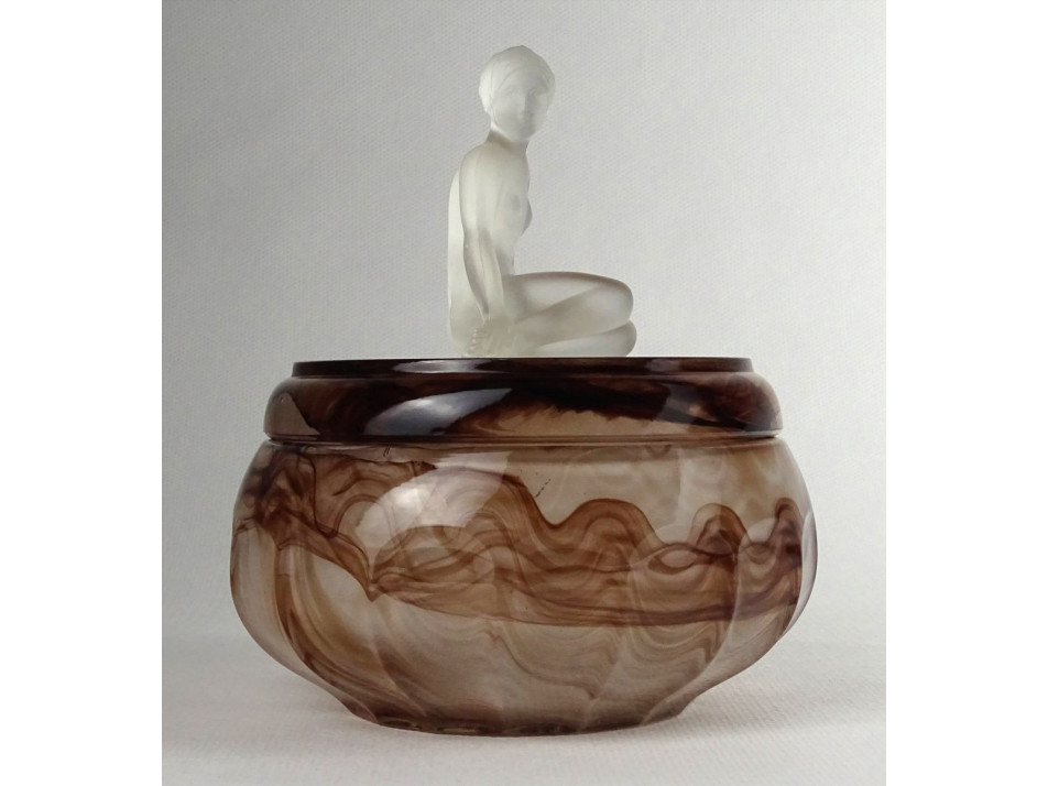 Régi, szép állapotú üveg szelence, üveg bonbonier. Tetején ülő női akt üveg szobor. A tető belső felén apró sérülés található, lásd fotó.