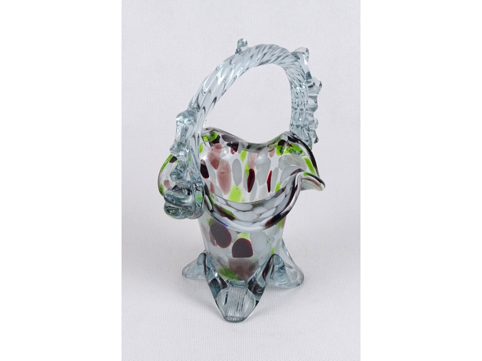 Hibátlan állapotú, színezett művészi üveg kosár dísztárgy, cseh fújt üveg a XX. század második feléből.