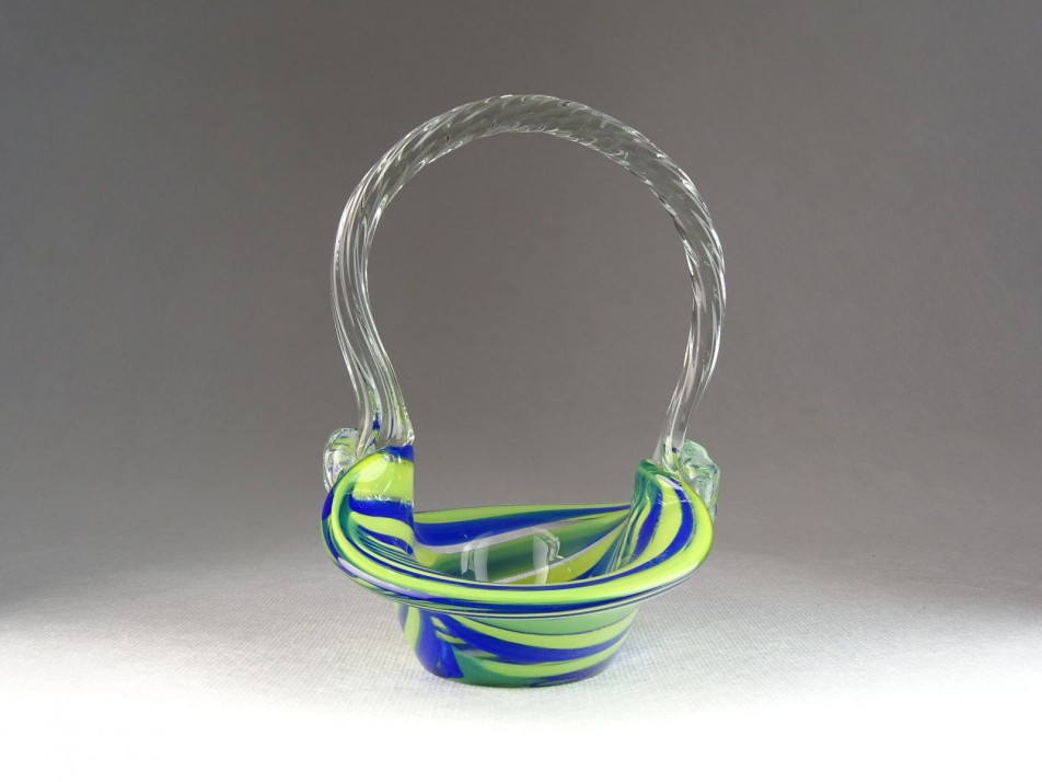 Hibátlan állapotú, színezett, csíkozott kék-zöld művészi üveg kosár dísztárgy, cseh fújt üveg a XX. század második feléből.