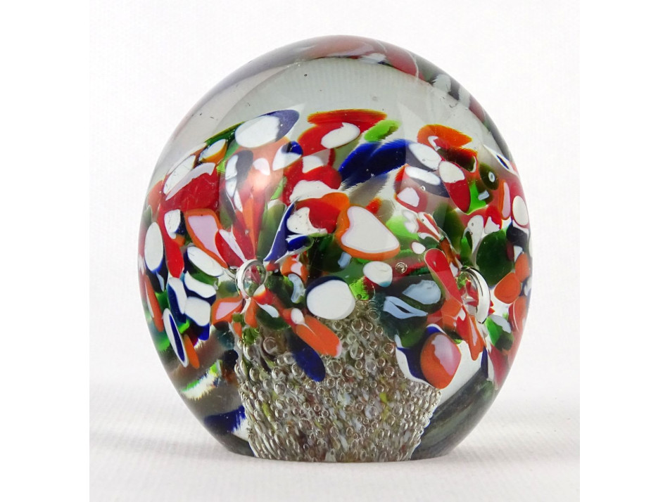 Régi tömör üveg dísztárgy, belsejében mályva fúvott színes virágokkal díszítve. Hibátlan állapotú íróasztali kellék, levélnehezék.