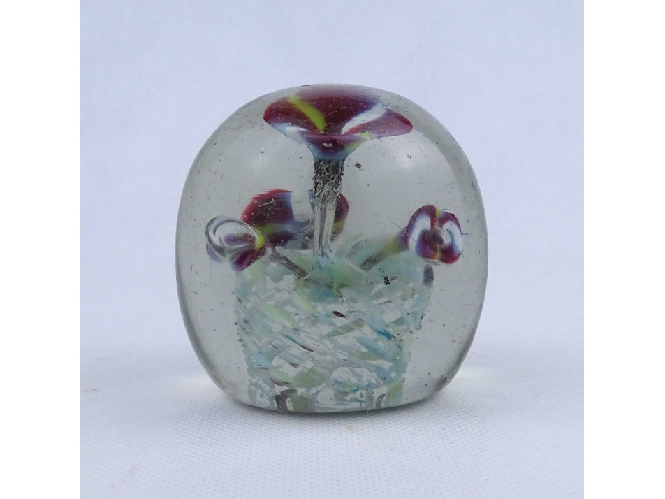 Antik, szép állapotú gömb alakú fújtüveg íróasztali kellék, üveg levélnehezék, belsejében négy darab plasztikus színes virággal. Alján látható a fújás és szakítás nyoma. A levélnehezék teteje a sok apró karctól elhomályosult.