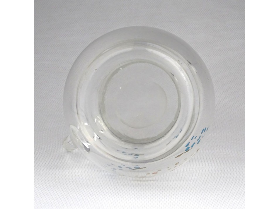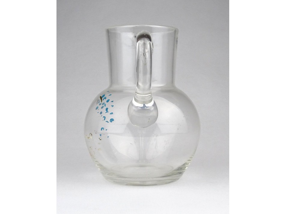 Antik, hibátlan állapotú, kézi festéssel díszített, kisméretű fújt üveg kancsó. Alján a szakítás kicsiszolt nyoma látható.
