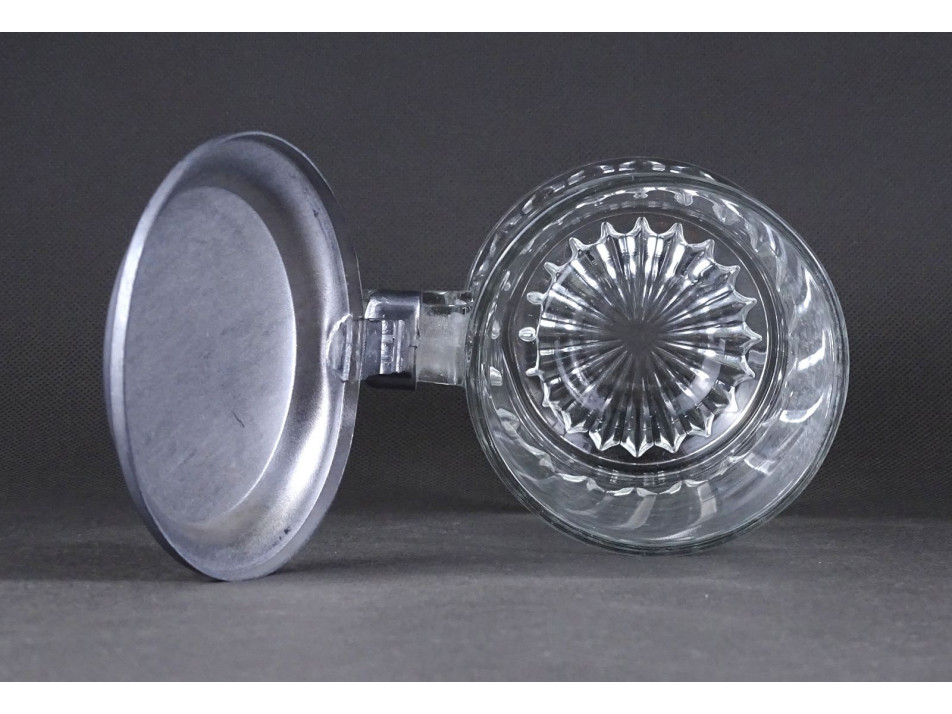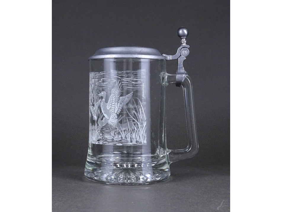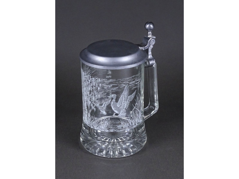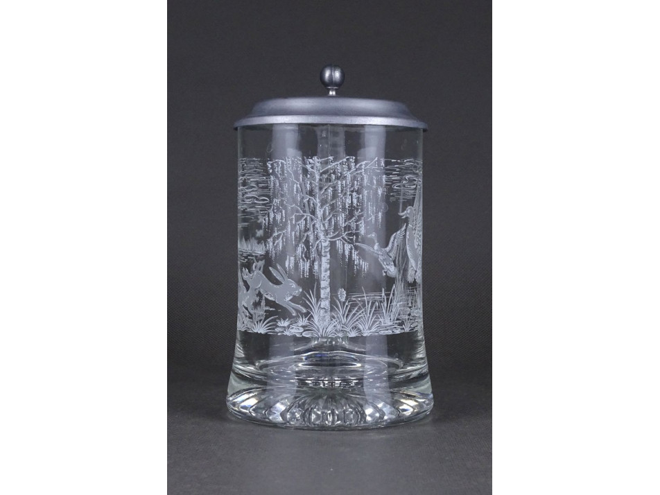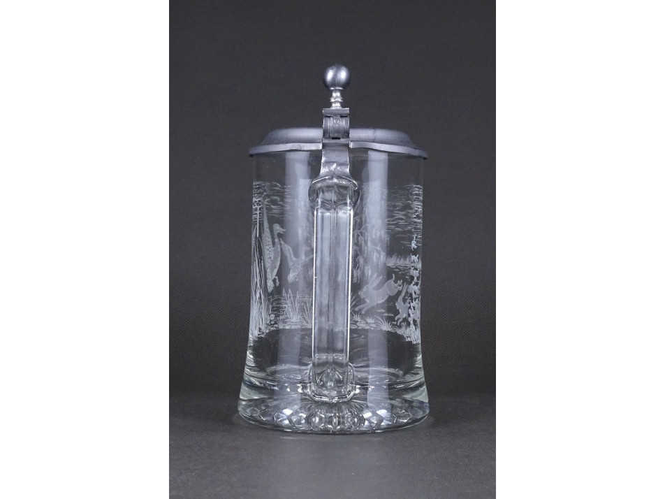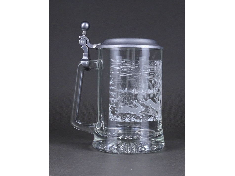 Szép állapotú ónfedeles üveg söröskorsó, sörös krigli. Oldalán fehér vadászjelenet díszítéssel, nyulakkal és kacsákkal.