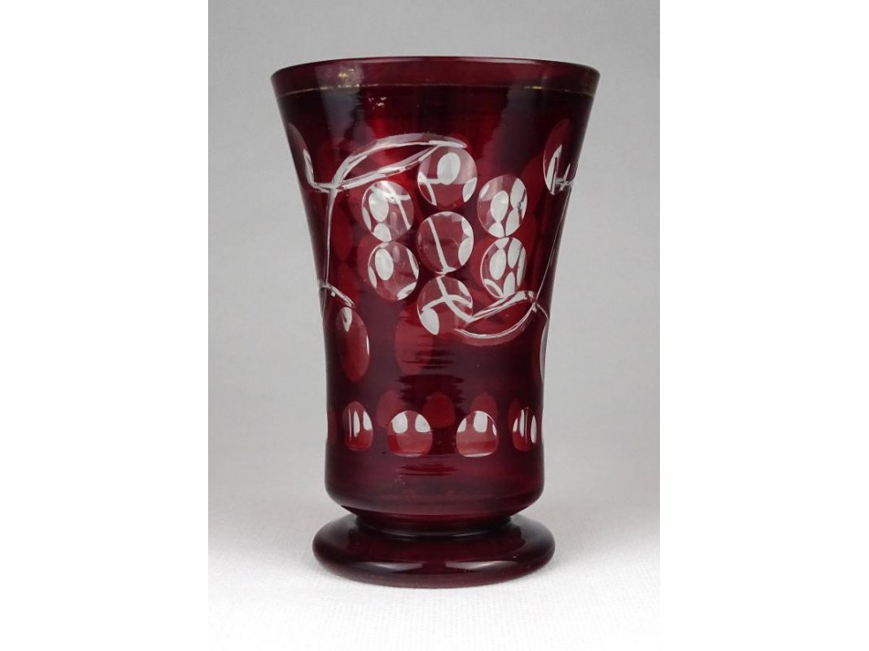 Hibátlan állapotú, régi, bordóra színezett rétegelt, talpas üveg pohár. Oldalán csiszolt díszítésekkel.