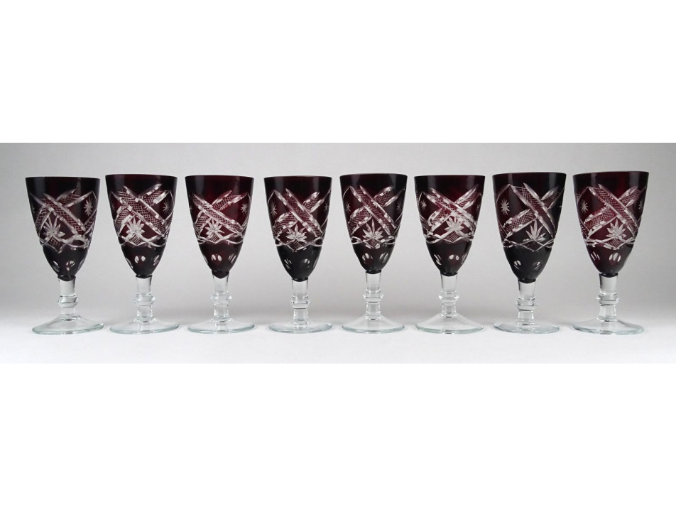Régi, nyolc darab egyforma, hibátlan állapotú, talpas csiszolt üveg pohár. Színezett, bordó színű poharak.