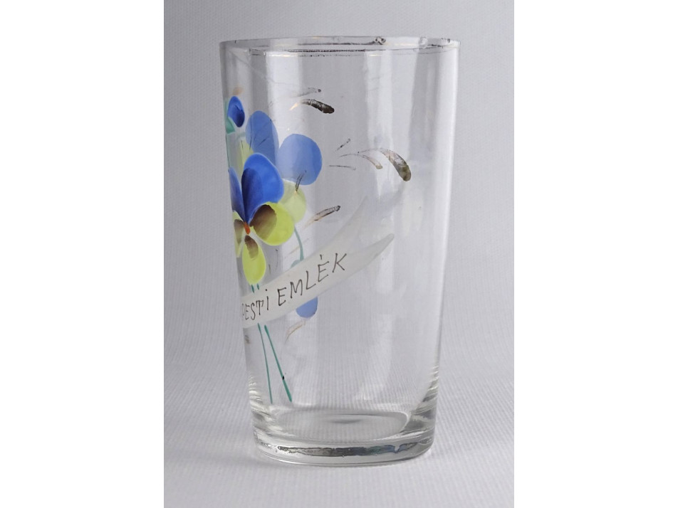 Antik fújt üveg pohár, emlékpohár. Peremén aprócska lepattanások találhatók, lásd fotó. Oldalán kézzel festett virágok és felirat: