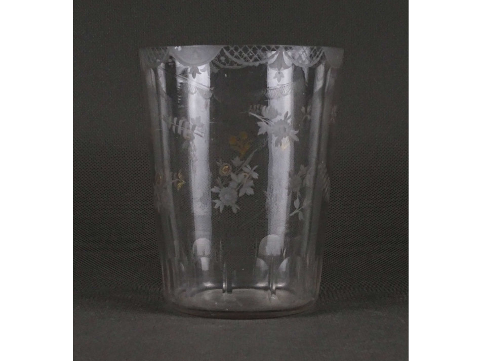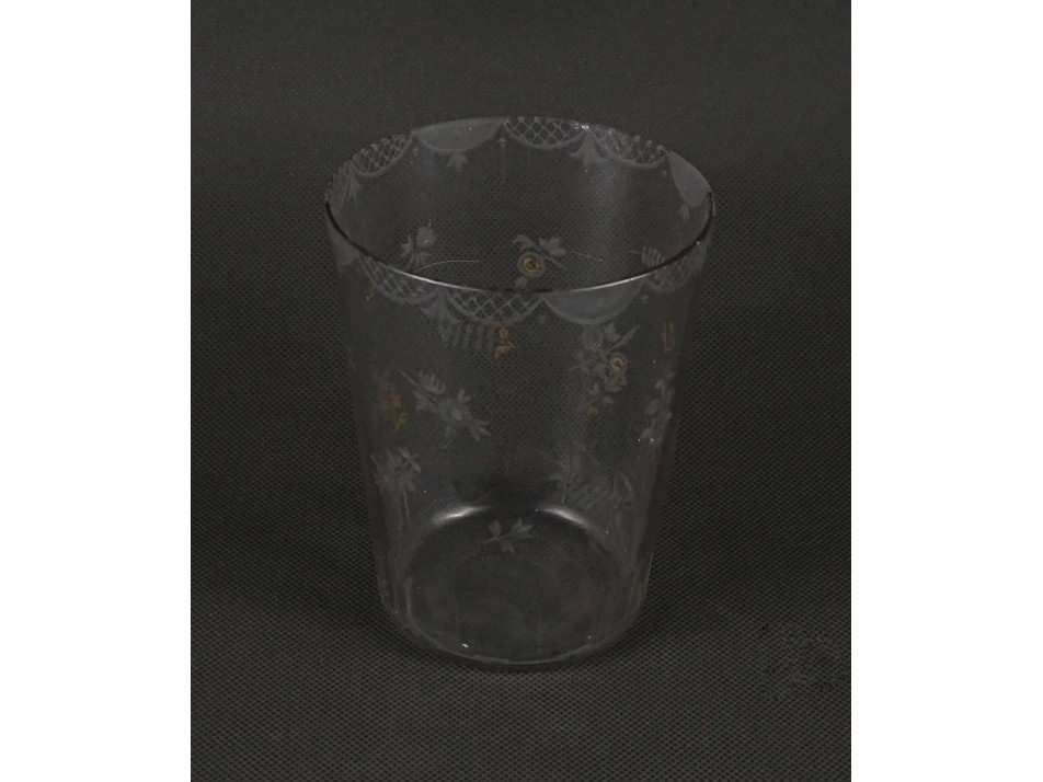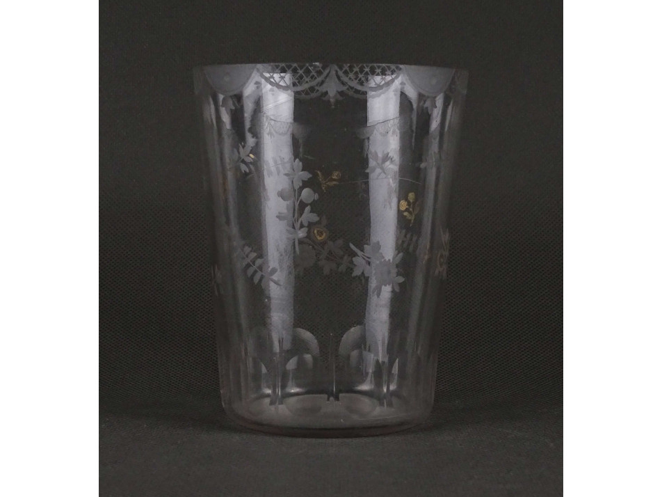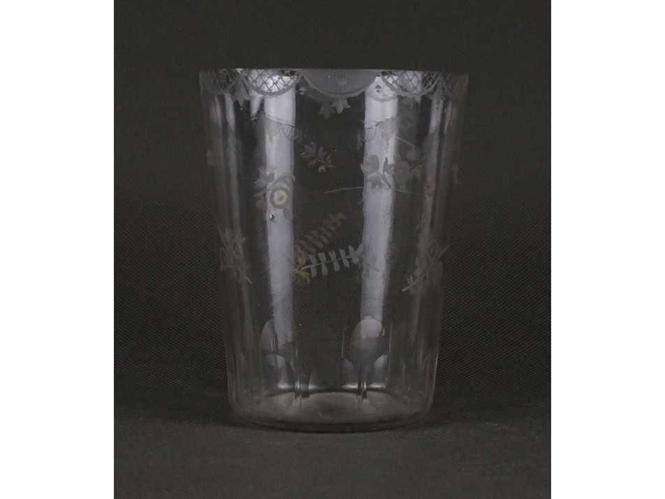 Antik, szép állapotú finom csiszolt virág mintákkal és aranyozással díszített vékonyfalú fújt üveg pohár, széles szájú szőlőmosó pohár.