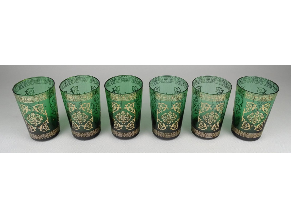 Régi, hibátlan állapotú zöld színű üveg pohár készlet. Oldaluk körben arannyal gazdagon díszítettek. Minőségi, igényes hat darabos pohár készlet.