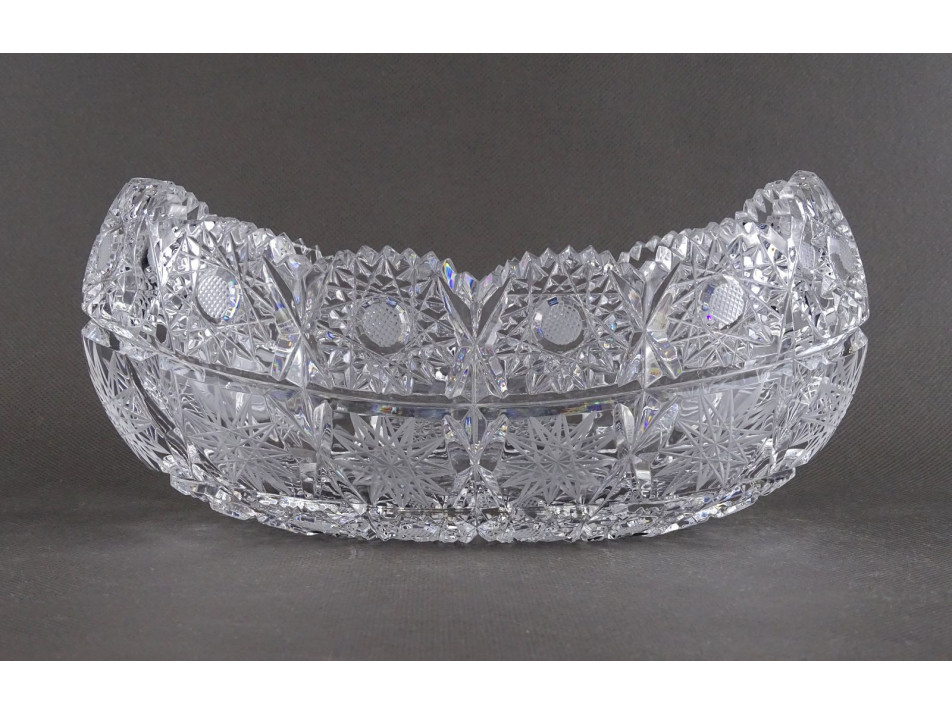 Csiszolatokkal gazdagon díszített, nagyméretű, vastagfalú gyönyörű ovális alakú kristály gyümölcstál, kínáló tál, gyümölcskínáló tál.