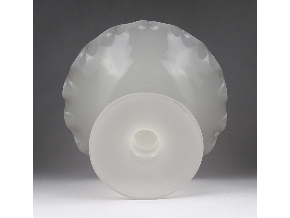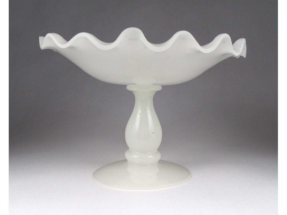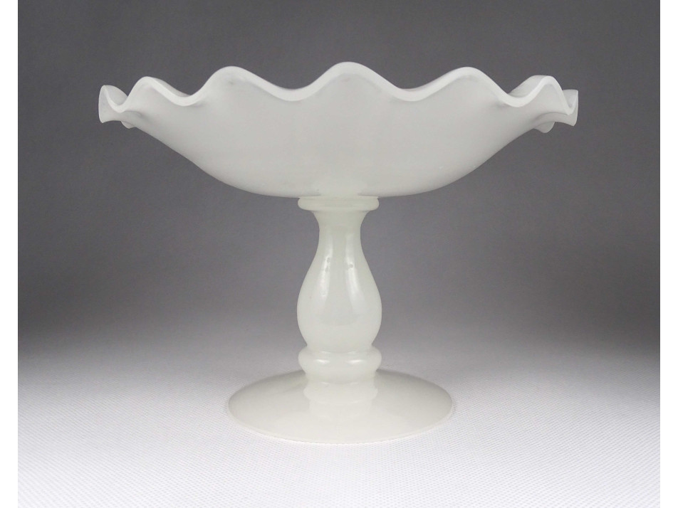 Antik, hibátlan állapotú, fehér kalcedon üveg, fújtüveg művészi talpas asztalközép kínáló tál, gyümölcskínáló tál.