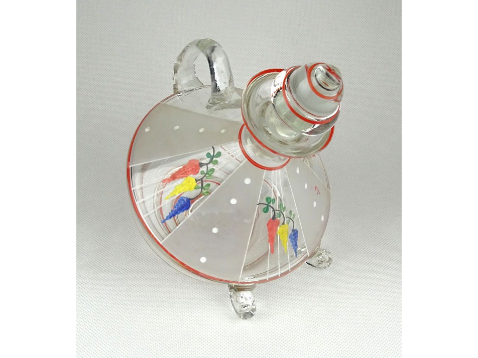 Régi, hibátlan állapotú, dugós likőrös üveg kínáló, italkínáló. Felületén festett motívumok, szőlőfürt díszítés. Érdekes, oldalára billentett, füllel és lábakkal rendelkező forma. Célja, hogy amíg ki nem ürül le nem tehető!