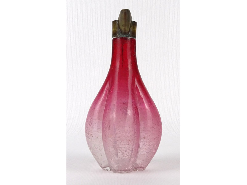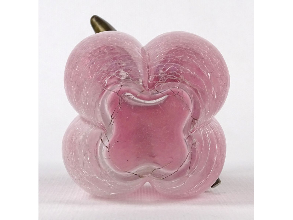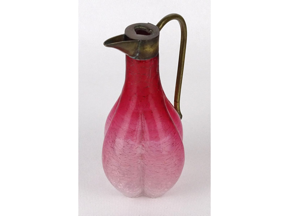Antik, szép állapotú, gerezdes testű gyönyörű rózsaszín repesztett üveg kiöntő, karaffa az 1800-as évek végéről. Réz fül és kiöntőcsúcs található rajta. Olajos vagy ecetes üveg lehetett.
