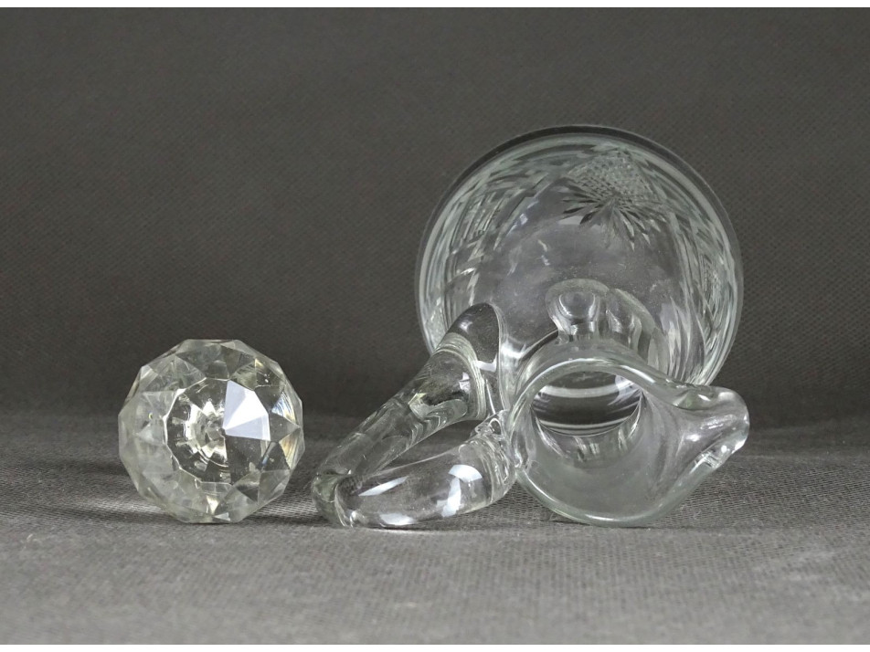 Régi, hibátlan állapotú, körben csiszolatokkal díszített, ecet vagy olaj asztali üveg kiöntő, kínáló dugóval.