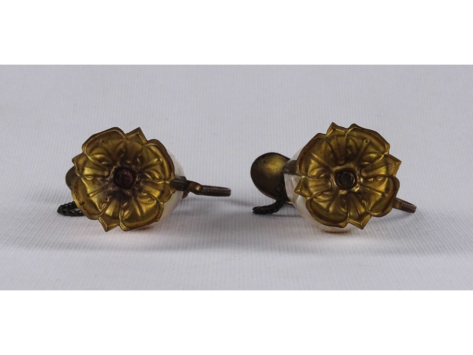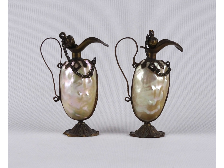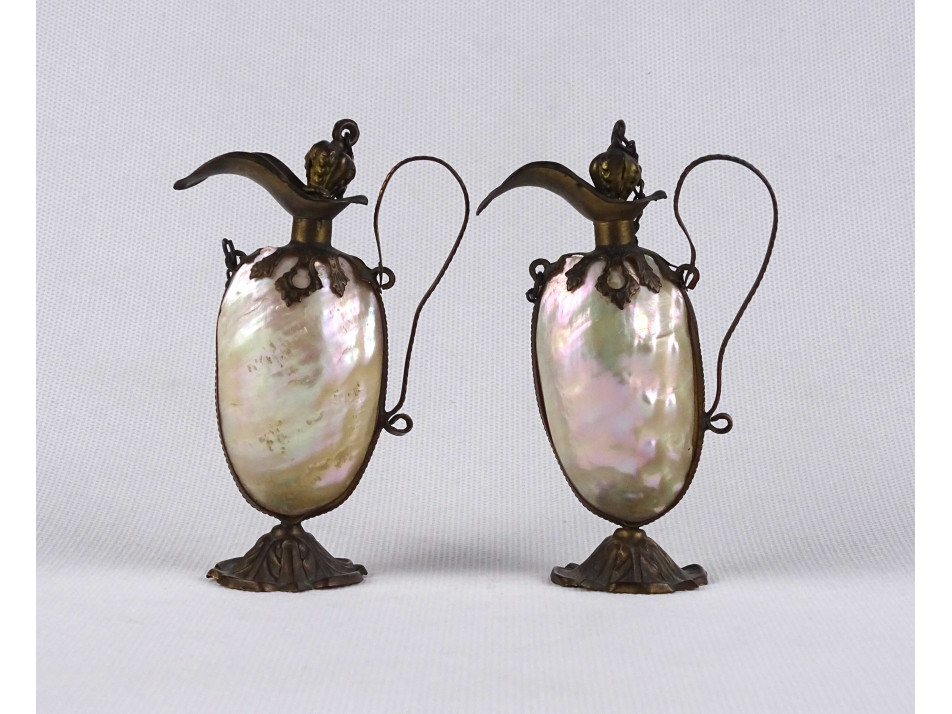 Régi kisméretű olajos ecetes kiöntő pár. Különleges kialakítású, a gyöngyházból készült testet préselt lemezrátét foglalat tartja egyben. Dísztárgy, valódi használatra nem alkalmas.