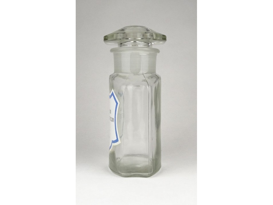 Régi, szép állapotú, áttetsző patika üveg, gyógyszerészeti tároló üveg.