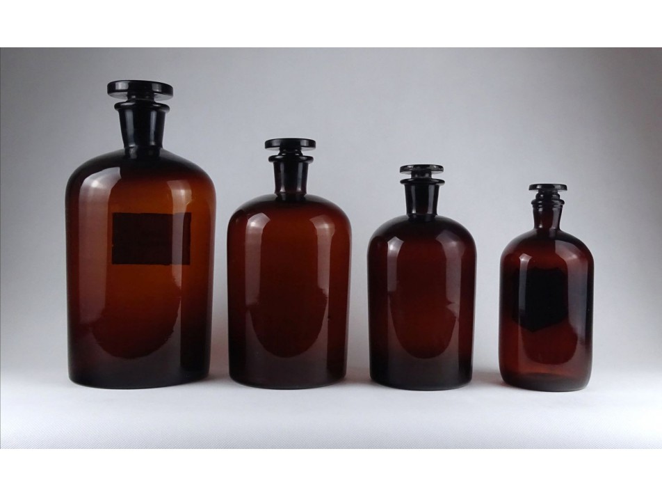 Négy darab régi, szép állapotú, barna színű patika üveg, gyógyszerészeti tároló üveg.