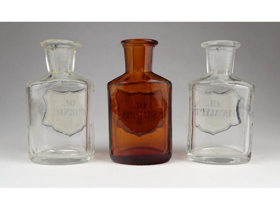 Három darab régi, hibátlan állapotú, kis méretű patika üveg, gyógyszerészeti tároló üveg.