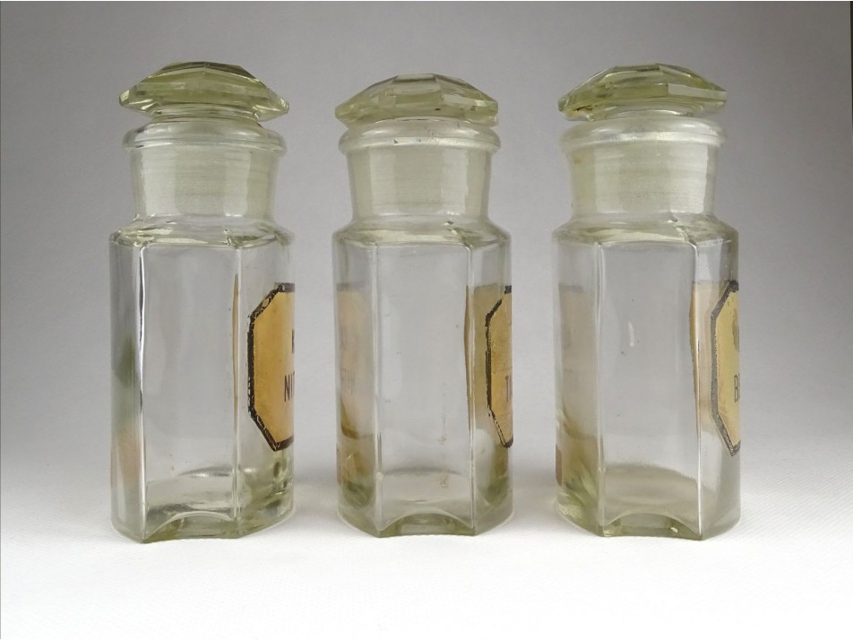 Három darab régi patika üveg, gyógyszerészeti tároló üveg.