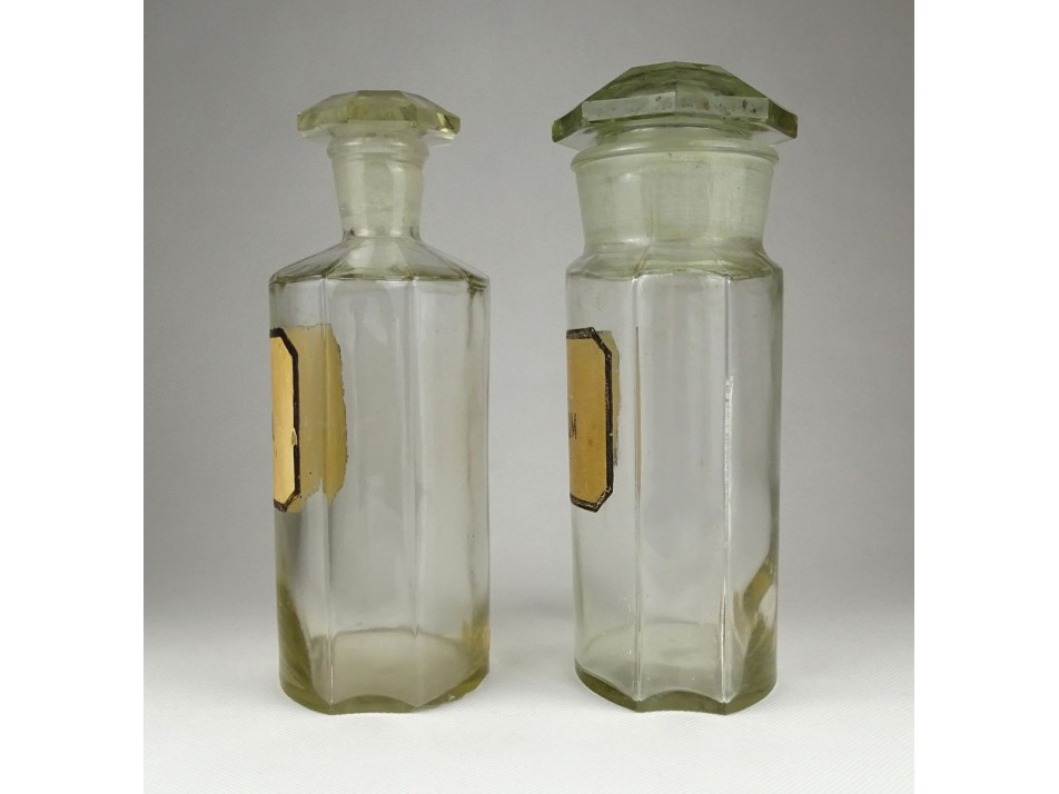 Két darab régi patika üveg, gyógyszerészeti tároló üveg.