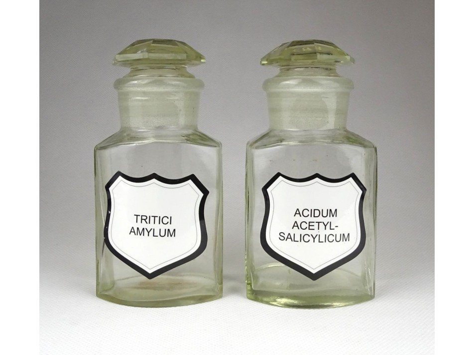 Két darab régi patika üveg, gyógyszerészeti tároló üveg.