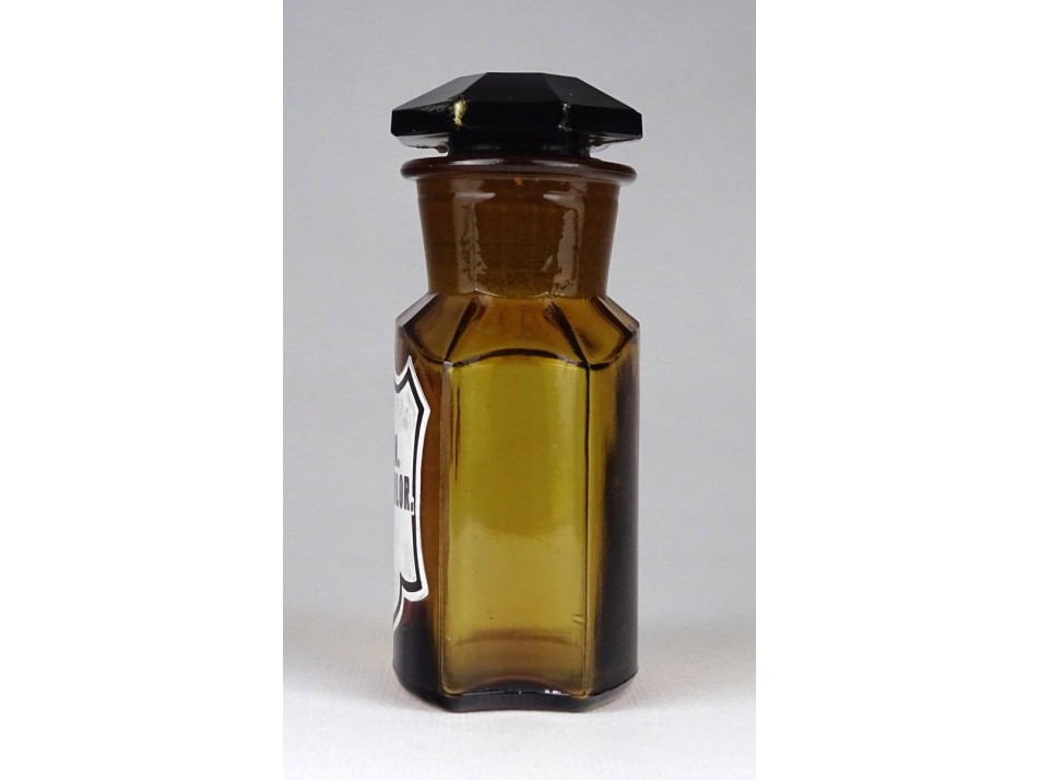 Antik borostyán barna dugós patika üveg CHININ HYDROCHLOR 12 cm