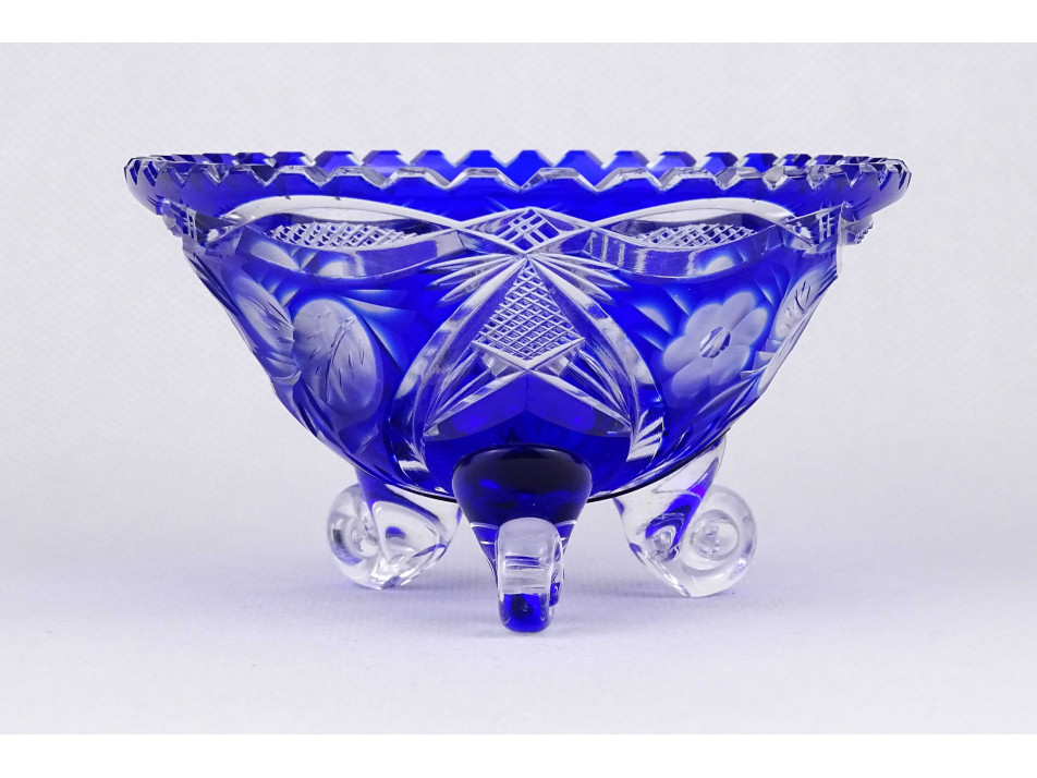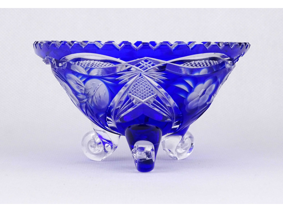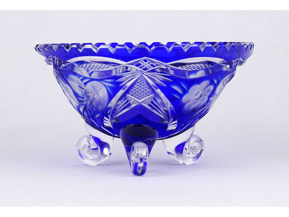 Hibátlan állapotú, kisméretű, csiszolatokkal gazdagon díszített, három csigalábon álló, kékre színezett kristály tál, tálka.