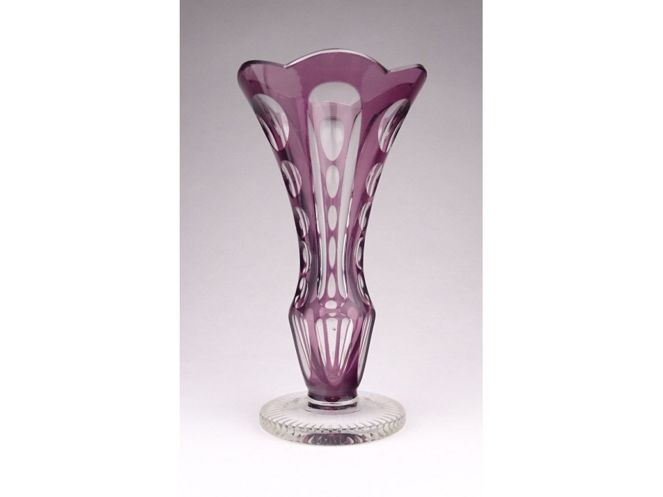 Régi, szép állapotú, lilára színezett kétrétegű csiszoltüveg talpas váza. Szálváza, egy szál virág számára.