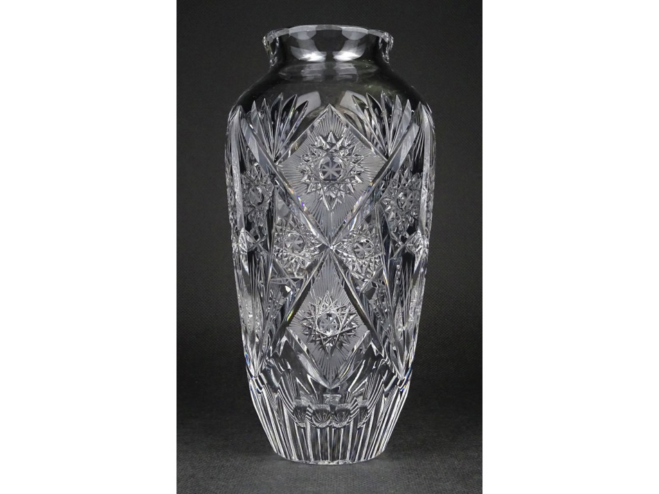 Hibátlan állapotú, csiszolatokkal díszített vastagfalú, kristály váza.