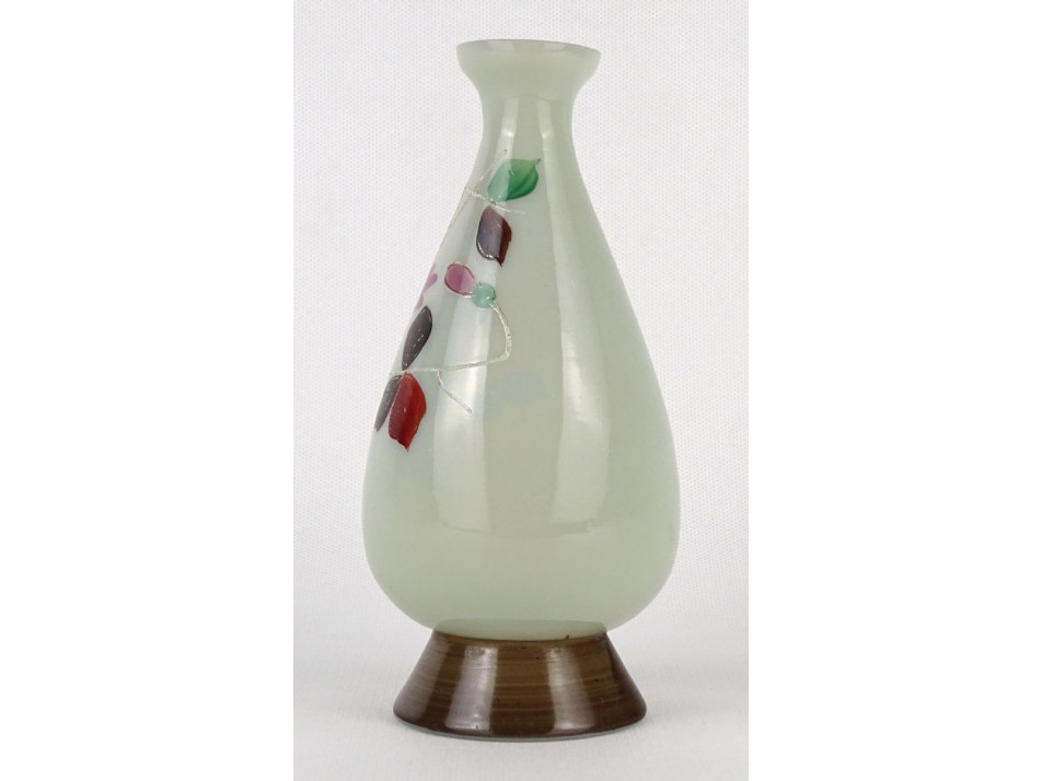 Hibátlan állapotú, színezett fúvott üveg váza, talpas art deco üveg váza, oldalán kézzel festettt motívumokkal díszítve. Talpán a fúvás szakítás nyoma szépen kivehető.