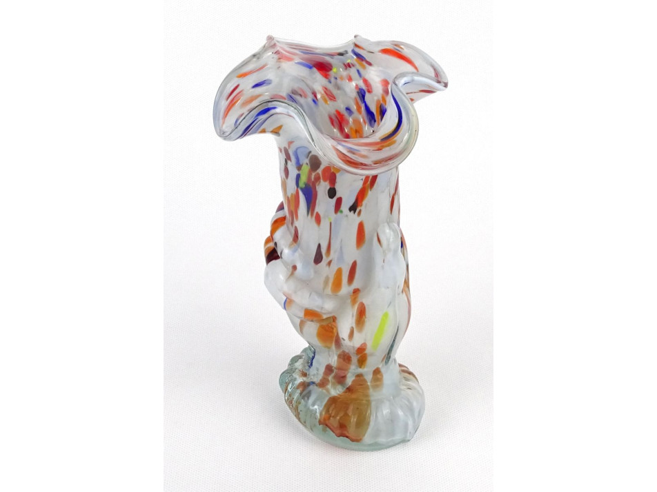 Régi hibátlan állapotú színes üveg váza, fújt üveg váza. Talapzaton álló kezet ábrázoló fodros szélű üveg váza, virágváza.