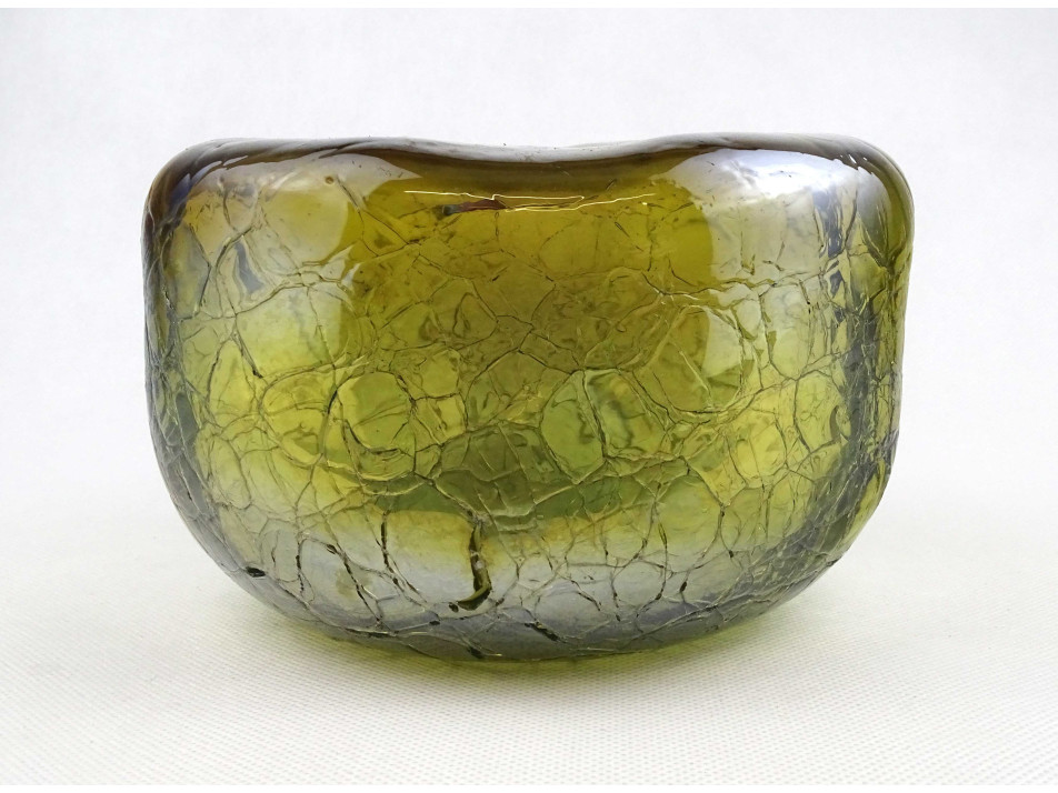 Hibátlan állapotú, gyönyörű, irizáló rétegelt kraklé, crackle, művészi üveg váza, design váza. Alján a fújás, szakítás nyomát csiszolással tüntették el.