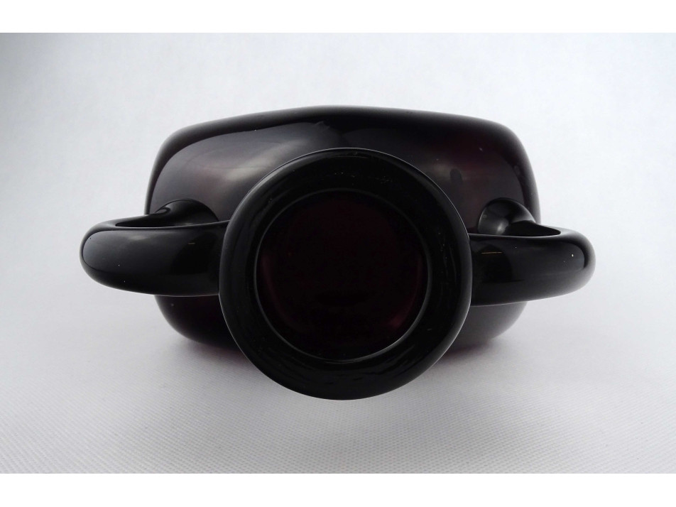 Hibátlan állapotú, vastag falú, mélylila színű művészi fújt üveg palack, kétfülű design váza, a 60-as évekből. Talpán a fújás, szakítás nyomát csiszolással tüntették el.