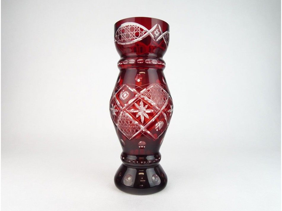 Szép állapotú, nagy méretű, bordóra színezett, csiszolt, gazdagon díszített, kristály váza.