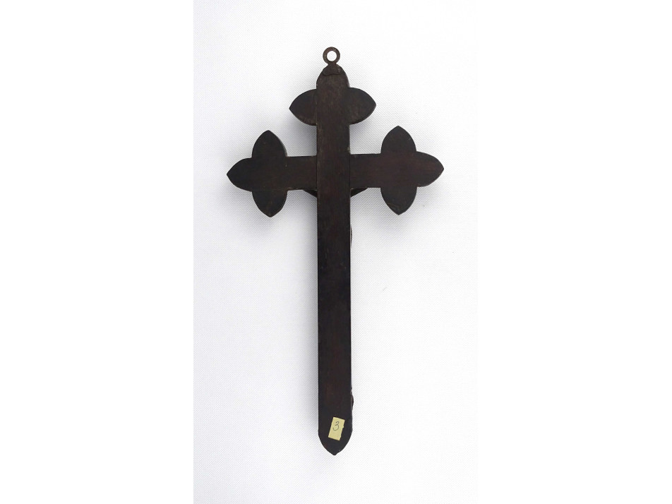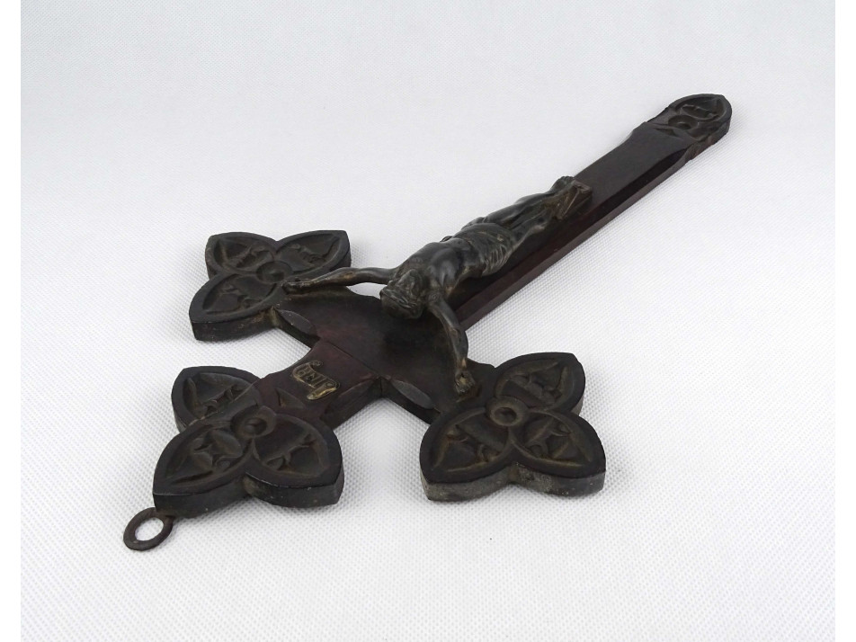 Antik, nagyméretű, gazdagon faragott fa feszület, kereszt, egyházi vallási kegytárgy. A feszületen ezüstözött, részletesen kidolgozott ón Jézus alak található.
