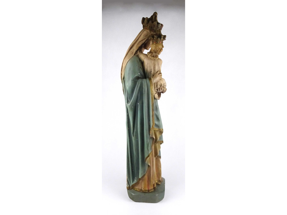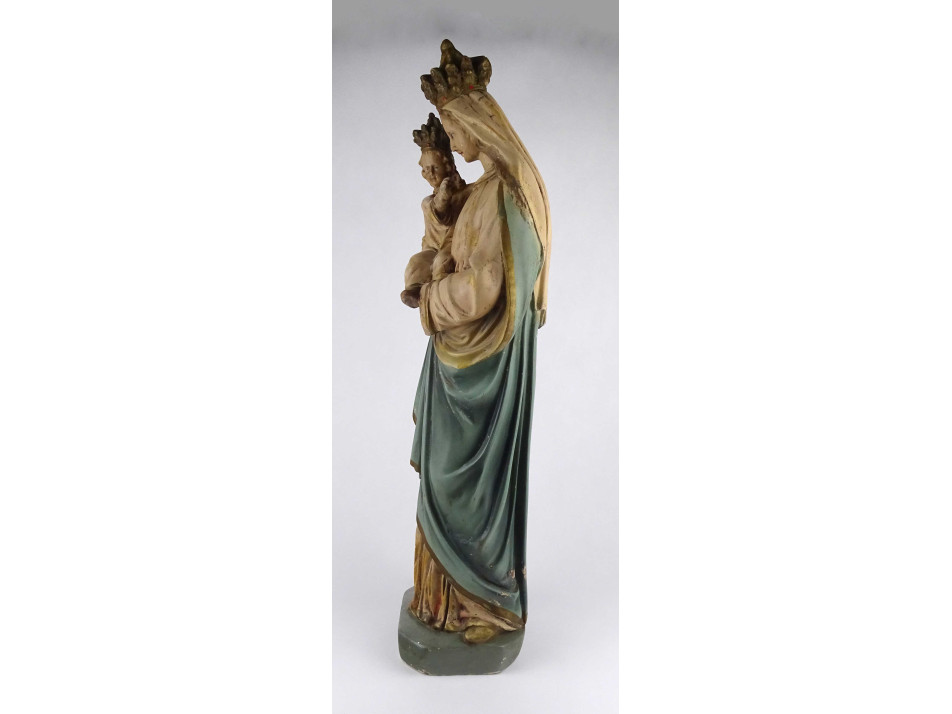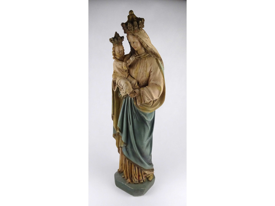 Szép állapotú nagy méretű festett gipsz szobor, Mária karjaiban a kis Jézussal. Aranyozott, festett antik darab, korának megfelelő patinás, kissé kopottas állapotban.