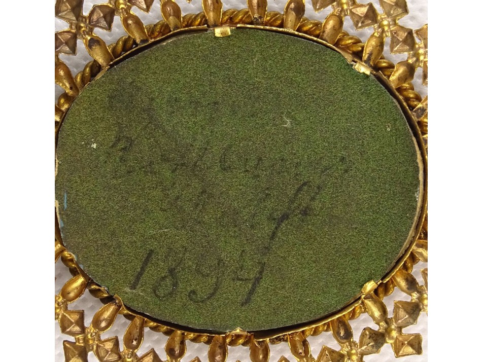Antik, kisméretű, áttört aranyozott keretben lévő, ovális alakú, kézzel festett ikon.