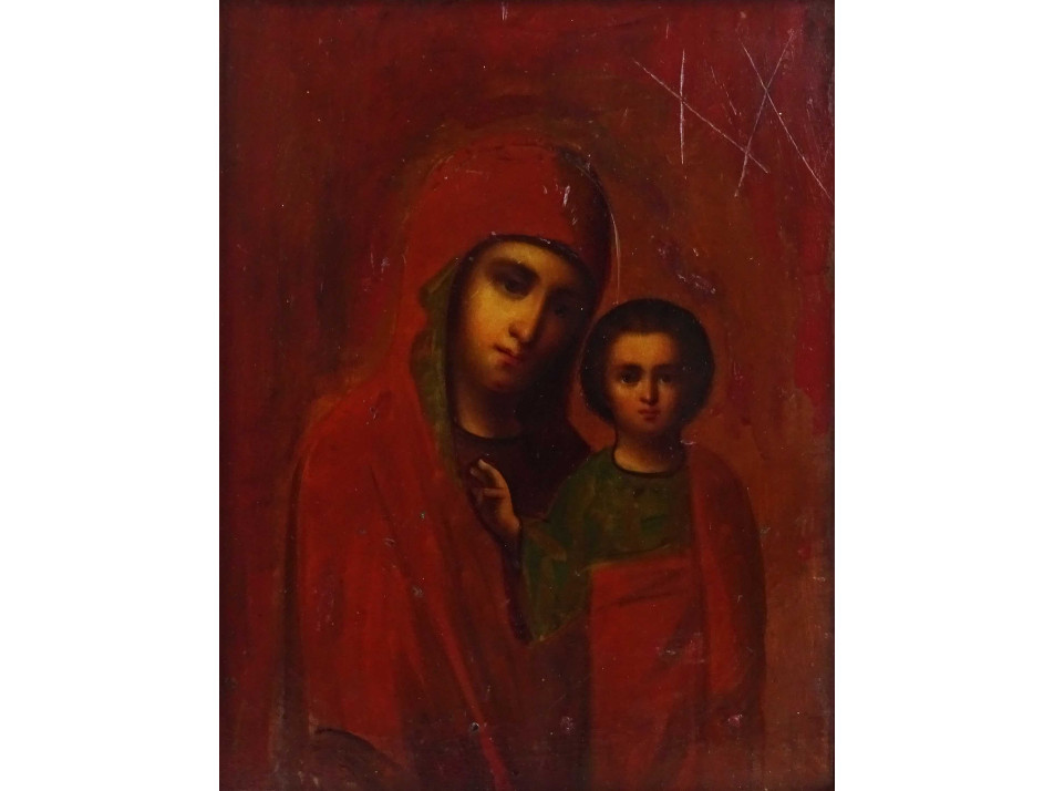 Antik, zárható, üvegezett keretbe helyezett ikontábla, Mária kis Jézussal festett ikon kép.
